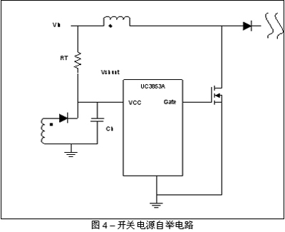 在开关电源设计中,脉宽调制器IC通常由辅助绕组供电,有关情况可参见图4。启动这种电路需要连续补充充电电阻(Rt)和吸持电容(Ch)。为了尽可能降低功耗,我们要让补充充电电阻尽可能大。吸持电容也应较大,因为它在电源开始开关之前都会向PWM提供能量。
